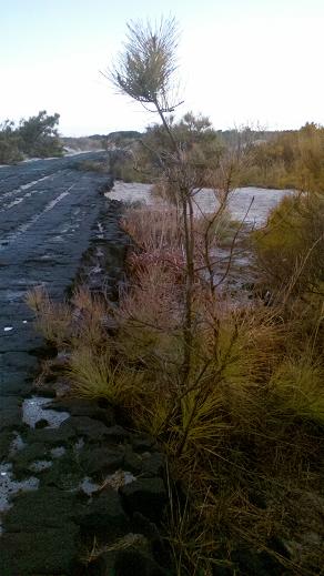 Sitting on the crumbling asphalt that the National Park Service has preserved as an object lesson of sorts from this era (as part of its "Life of the Dunes Trail") is a strange experience. The road surface is pitted and grooved by the action of wind and scouring sands, and at its edges it crumbles away in bizarre irregular shapes reminiscent of bluffs and mesas in the desert West. The sight offers food for reflection on what all too often becomes of man's plans where the land meets the sea. The stuff literally crumbles to the touch; Americans do not build roads as the Romans did in several sturdy layers of stone that led them to say with justice in Latin "to fortify a road." Here scrubby evergreens no more than three feet tall, with yellowing needles, are gradually reclaiming the island from the careless builders of fifty years ago.