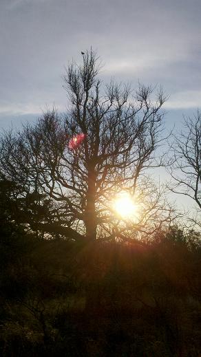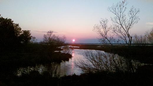 Sunset is now definitely upon me and I photograph its change from brilliant orange to deep pinkish red through gaps in the trees caused by tidal creeks. No specific blessing for seeing a beautiful sunset comes to mind, so I recite one from the shacharit, the Jewish matins—"Blessed are you O Lord our God, King of the Universe, who opens the eyes of the blind." For this gift of truly seeing, I thank You, O Lord. An owl calls through the trees as the sun disappears.