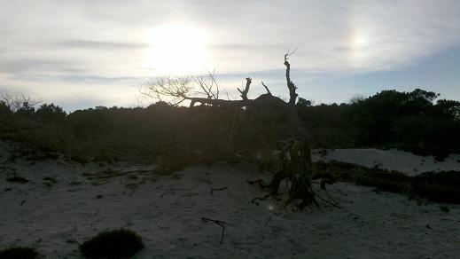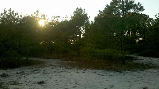 Walking back to the north from this spot, I am rewarded for undergoing the showers earlier with a pale strip of rainbow, surprisingly close on the right to the westering sun. My eye is caught by brilliant flashes of white through the trees to the west of "Bayberry Drive," the road I am following. I walk about ten yards through the loblolly pine forest and emerge in a clearing where the ground is all white sand. About half an hour later I explore another of these clearings, which seem to be quite common in this part of the maritime forest. The conquest of sand by plants is simply incomplete here.