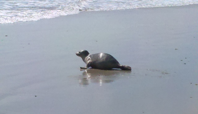 And then I see a seal! The ranger I talked with yesterday about the shipwreck mentioned that gray seals (Halichoerus grypus) and harp seals (Pagophilus groenlandicus) have been seen on the Assateague beaches lately, but he warned me not to approach them too closely, because they bite. I kept a respectable distance from this one as he used his flippers to crawl back into the water. He was a shiny medium gray.