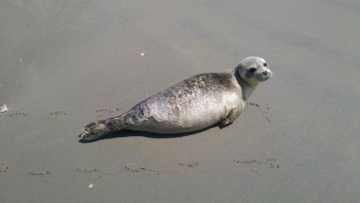 Here once again I am in a barren, flat land of sand. A partly dried channel of gray, lumpy sand shows where seawater flowed just recently, behind that, two large pieces of driftwood make an acceptable makeshift bench. After encountering the gray seal, I had an even closer encounter with a pale-faced harp seal, who showed no fear as I came within five feet of him to take my pictures. He just gazed at me with his liquid dark eyes.