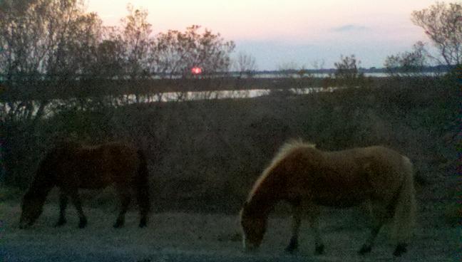 One thing I have not seen on this hike is the Chincoteague ponies. I have seen their dung in a few places, but they seem to shun the northern reach of the island, which grows increasingly narrow and barren of forage as you approach the inlet. I haven’t seen them since this morning, when I spotted a fine herd of seven or eight mostly brown beasts grazing on both sides of the road near the campground.