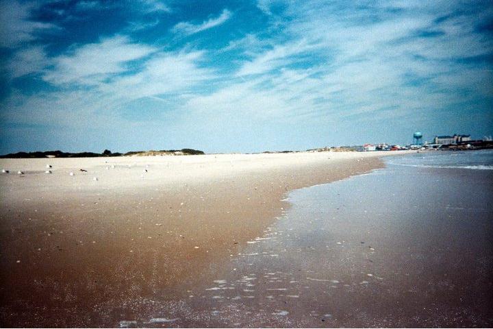 Trudging further north still, I begin to experience a kind of Zeno’s Paradox effect, as the hotels and Ferris wheels of Ocean City gradually gain greater sharpness and detail, but the line of breakers stretches on and on. Half the distance, and half of half, and half of half of half… Yet I sense, too, that the island truly is beginning to narrow, an almost mystical feeling as if I were approaching the hypothetical vanishing point, with the twin lines of railroad track replaced here by the bay shore to my left and the ocean shore to my right. And yet the breakers are still breaking, the shoreline curving inward here and again to make a shallow bay, then curving back. Half of half of half of half… I enter a zone where the white sand devils appear to have to come to rest, smooth abstract curves of white amid darker sand. Ahead in the northern sky unusually thick swirls of cirrus cloud stand in dramatic contrast to the sharp blue sky – a true sign of autumn, on this hot day.