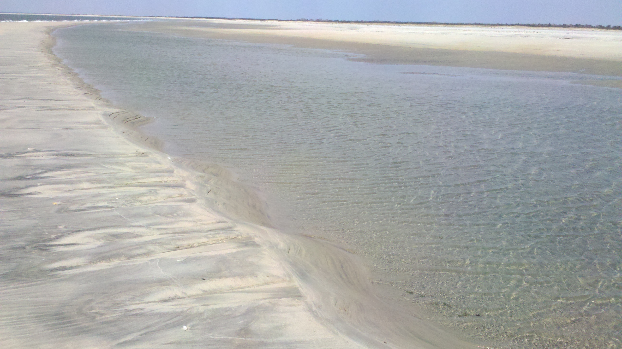 The sandy beach begins to give way to rich mud flats, seagulls foraging in the rich sulfur-smelling stew where myriads of shells lay scattered. Here many of the shells are broken or bleached white or both, as they slowly disintegrate, releasing their calcium back into the environment. The bay water separating the island from the mainland comes in bands of dramatically differing colors, pale blue-green alternating with near-cobalt. |