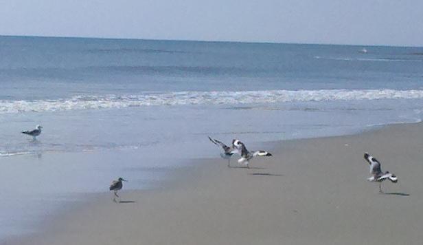 Just short of the inlet, American oystercatchers with their black heads and long, bright orange beaks join the two or three species of gull in looking for food. The gulls are large and brown, or smaller and a classic gray white, or large again with white heads and black wings. I’m afraid I’m no expert at distinguishing the species. The oystercatchers are shyer of my approach and my camera, and take off with high-pitched squeals when I approach. Also skittish are the little gray-and-white checked piping plovers, rooting around in the wet sand for their portion.
