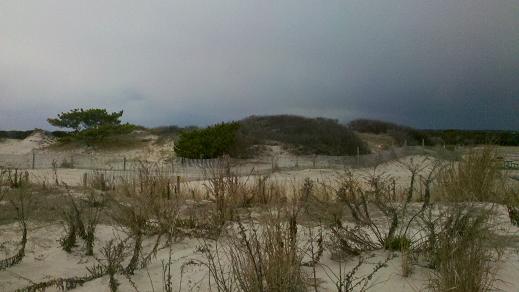 3:00 p.m., Assateague State Park The spattering of rain I drove through on the way here is gone, and has proved to be something of a blessing for walking, since it tamps down the sand all along the beach, making for firm footing. The skies have now partly cleared and the temperature is in the low to mid 50s. On the shoreward side of the dunes there are some small, isolated sprouts of a light green succulent plant. The leaves can't be more than a half inch long and no more than a quarter of that wide at their widest. To the touch, they have the soft, waxy feel one would expect. One of the leaves is so shiny it looks wet. Relatively few gulls are out. A small crowd of fifteen to twenty adults and children are out playing baseball and flying kites as I first emerge from the parking lot of the State Park. 3:20 p.m. The sky to the west-northwest over the mainland is an ominous bruise color, and the breeze is turning chillier. Several yards of the snow fencing meant to protect the fragile dunes from horses and people has blown down and been covered in sand from a winter storm, and unable to resist my curiosity, I walk cautiously up to photograph, being careful where I step for the sake of the plants. Here the succulents are more numerous, sufficiently so to look like a miniature forest sheltering under some taller dried-out plants. 3:52 p.m. Walking south along the shoreline I come to a field of flotsam that looks from a distance like plain dirt or litter but up close proves to be lots of shells and shell fragments, among which little sandpipers and bigger gulls are feeding. So far I have seen only one skate egg case, further back. They look like shiny miniature rectangular black purses, with irregular stems or cords at each corner. Like the fringes or tzitziot that God commanded the children of Israel to wear "at the corners of your garments." Only rigorously Orthodox Jewish men take this to mean that they must wear appropriately fringed undershirts; for others like me, the tzitziot are merely fringes of the tallit or prayer shawl that is worn at morning prayers in the home or synagogue. I confess I have not done much tefillah/davening (prayer) lately. Here on Assateague, though, I always feel God's presence, an admittedly nebulous statement. As I walk on the bruise-colored clouds move in to take up the northwestern-to-northern quadrant of the sky. The wind blows harder and the spitting rain briefly turns into a pelting shower, forcing me to take shelter in the portico of a locked-up bathhouse at one of the State Park campsites. That's where I'm writing this, though by now the shower appears to have passed. I seem to be near the southern end of the State Park campsites, and consulting a map which I am able to download to my "smart phone," I see that I've covered almost half the distance to my destination for the day, the southern end of the National Seashore campsites. Then of course I have to walk back, which I plan to do along the road (which ends at the southern end of the National Seashore campsites), with brief excursions into the marsh and forest on the western, bay side of the island, weather permitting. 4:48 p.m. Entering the National Seashore from the north, I stumble on a fifteen to twenty foot shipwreck, all old timbers and rusting iron, washed by the waves. A park ranger patrolling in an SUV tells me that its provenance is unknown, but it has been catalogued. Signs warn against swimming due to an "underwater obstruction," but the ranger tells me the shipwreck was actually uncovered by the winter storms, and they hope it will be covered up again as the current build the sand up in the course of the summer. He also warns me to watch out for people attempting to pry metal off these shipwrecks, which are numerous along the island. This is illegal; the government of Spain has shown active interest recently in recovering artifacts from these shipwrecks, many of which are Spanish vessels from the great European Age of Exploration. The wind has dropped and the sun has come out intermittently. The sky is still mostly overcast, but at least the bruise-colored storm clouds are gone. 5:28 p.m. Dramatic dark blue clouds from the west again bring rain with them, this time a little harder than before, and I am forced to seek shelter again, this time in some restrooms at a public beach that fortunately are open. I will wait for the shower to pass before proceeding onward. While waiting out the shower I call up The New York Times on my smart phone and read about an Israeli air attack that killed three Hamas "militants" (murderers and terrorists that the Times refuses to call by the proper term, but that's a topic for another day). Thoreau would have been horrified by the relentlessness with which these horrors pursue us even in isolated places of natural beauty, and doubtless I shouldn't have tortured myself in this way by reading about it now. But my I reflect that the same sea booming in breakers beyond the dunes also breaks on the shores of Israel and Gaza. Our world is all one, now more than ever, and there is no escaping this truth. 5:56 p.m., on "Baltimore Boulevard" Emerging from shelter at the end of the last rain shower, I see the sun emerge too, in watery veiled fashion, from behind a gray diaphanous curtain of cloud. The air turns colder. Before long, I enter a stretch of dunes that present a dramatic, even comical aspect in the strange shapes wind and water have sculpted them into. One has a huge notch in it, large enough as it seems, when I draw closer, for a man to sit comfortably in. Perhaps this was created by a wave during a storm, a supposition that gains strength when I walk past a dune several yards behind it, a much more rounded, lower sand hill around which is a sort of dry moat, this clearly excavated by surging ocean waters.Saturday, April 2, 2011: From Assateague State Park to the Dune Trail