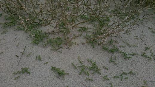 The barren portion of the hook I have just walked down looks on a map like bare bone, but at its southern end it bends westward toward the mainland, and this part looks thicker and fleshier. The dunes are higher here and there is an covering of brush in places over the bare sand.