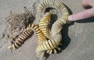 I run into a couple in their early 60s who honeymooned here 39 years ago. The man points out to me a yellowish piece of coiled flotsam a foot and a half long that is segmented like a dryer exhaust tube, although the individual segments are solid and look white as sliced potatoes inside. These are whelk egg cases.