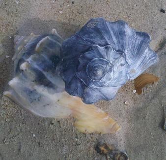 I made my way through the knobbed whelk shell paradise. There are also shells of the lightning whelk (Busycon contrarium) here, the difference being that their spiral is counterclockwise and their opening is on the left. I've only ever found one of those, and today I don't see any. I pick my through the knobbed whelk shells, trying to be selective since my collection has already grown to the point where I can't possibly display it all. So I look out for shells that are unusual in some way, such as a tiny bleached white whelk shell less than half an inch long, or with richer interior colors. |