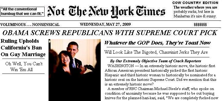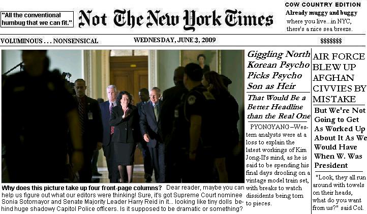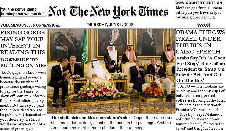 | Author's note: While it's probably a mistake to attempt to explain satire, I want to note that the above parody of the Times front page for June 4 is not meant to imply that all Arabs or Muslims hold fanatical warlike views on Israel and the United States, which is plainly false and ridiculous. There are two targets of satire here: the pompous, lazy, cliché-ridden and profoundly uninformative journalism of the Times, and the disturbing fact that, in my view, President Obama's well-intentioned overture will be taken by many as "throwing Israel under the bus" and will therefore unintentionally serve the interests of the jihadis rather than the interests of peace. |