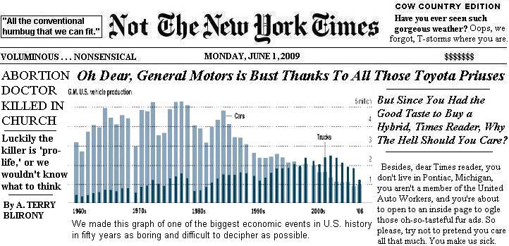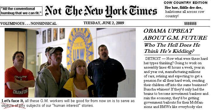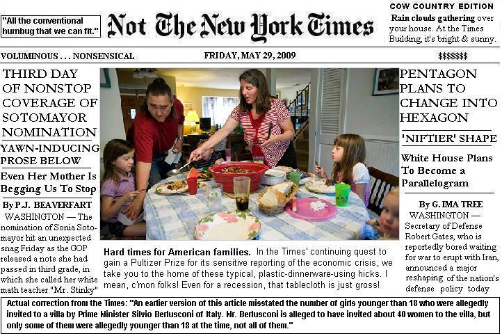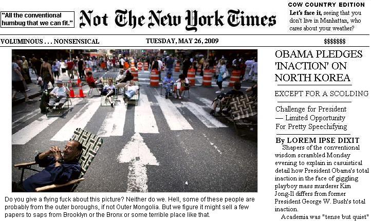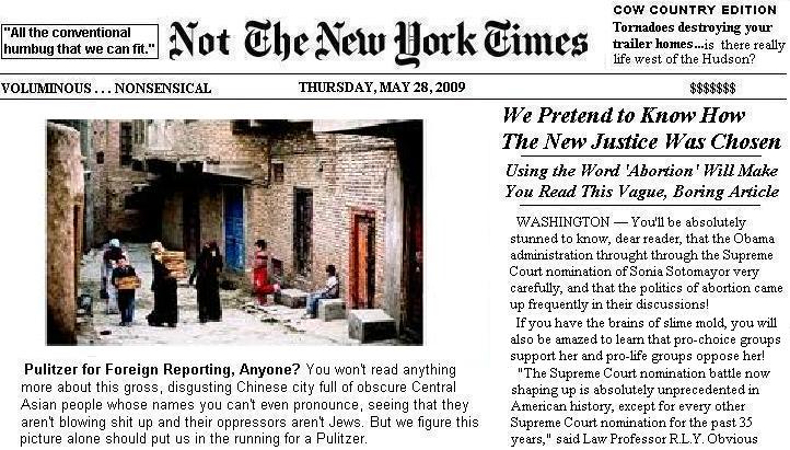 | Author's note: While it's probably a mistake to attempt to explain satire, I want to note that the above parody of the Times front page for June 4 is not meant to imply that all Arabs or Muslims hold fanatical warlike views on Israel and the United States, which is plainly false and ridiculous. There are two targets of satire here: the pompous, lazy, cliché-ridden and profoundly uninformative journalism of the Times, and the disturbing fact that, in my view, President Obama's well-intentioned overture will be taken by many as "throwing Israel under the bus" and will therefore unintentionally serve the interests of the jihadis rather than the interests of peace. |